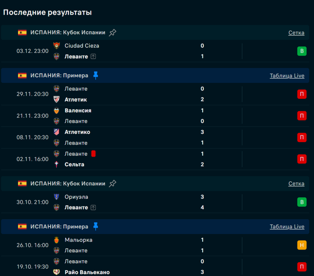«Леванте» обыграл «Сьесу» в Кубке (1:0), проиграл «Атлетику» (0:2), «Валенсии» (0:1), «Атлетико» (1:3) и «Сельте» (1:2). Команда создаёт моменты, но не забивает, а в обороне допускает системные ошибки.