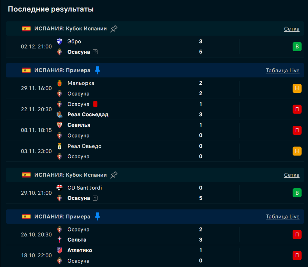 «Осасуна» победила «Эбро» в Кубке Испании (5:3), сыграла вничью с «Мальоркой» (2:2), проиграла «Реал Сосьедад» (1:3), «Севилье» (0:1) и «Реал Овьедо» (0:0). Несмотря на низкую результативность в Примере, кубковый матч показал, что атака способна на всплески.