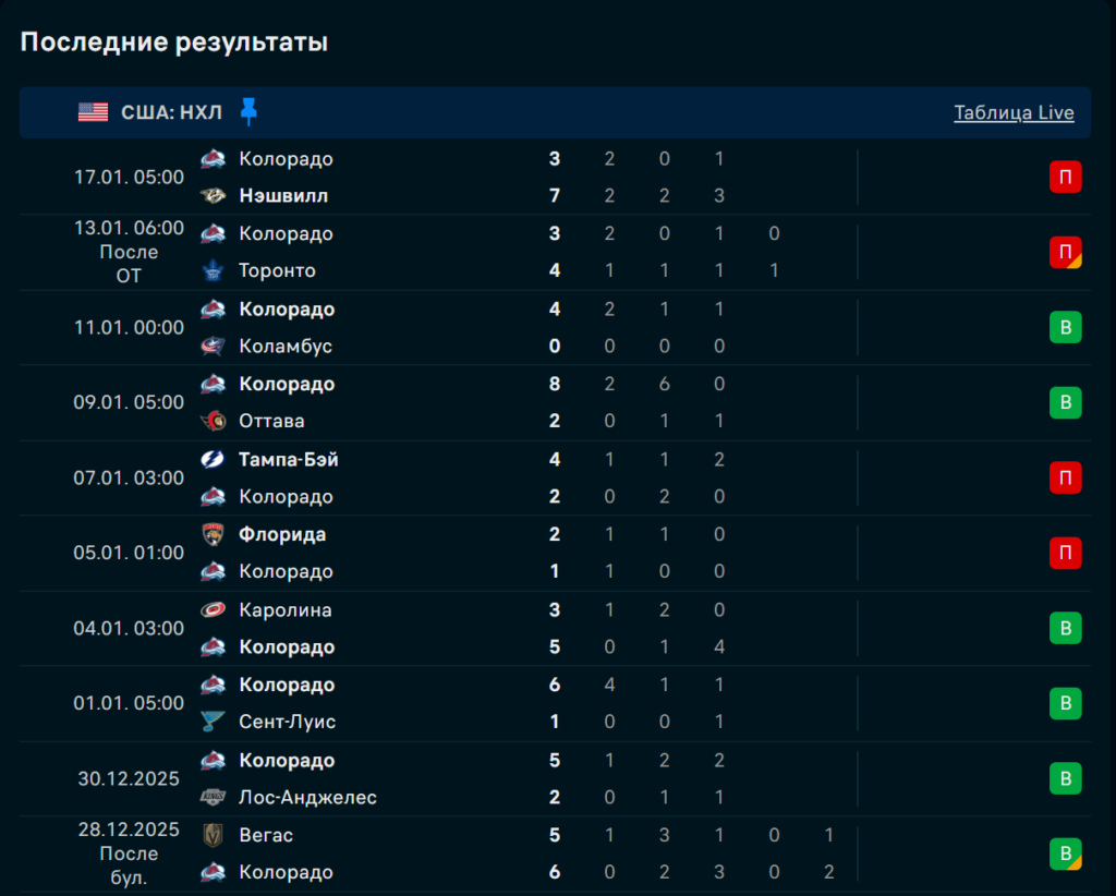 - Колорадо не проигрывает дома в 17 из 19 последних очных матчей