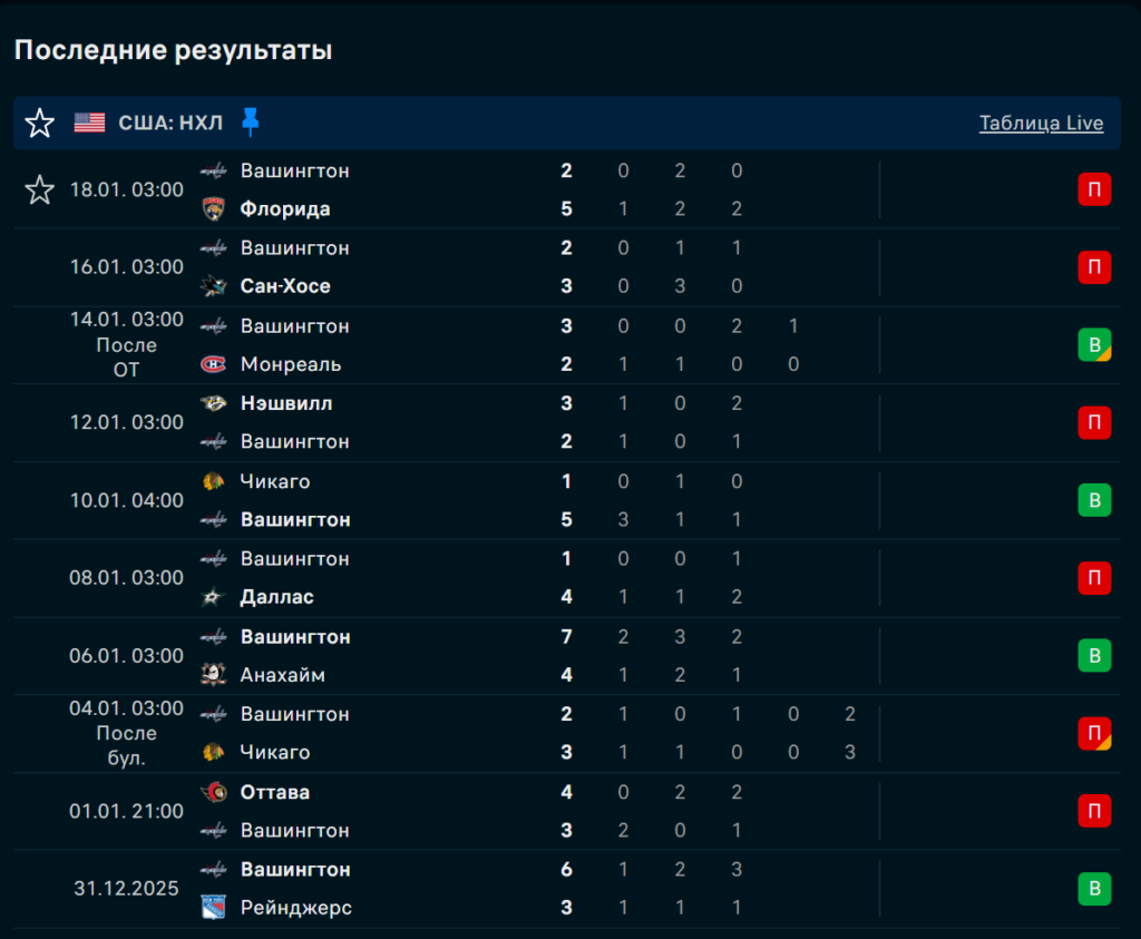«Вашингтон» борется за Wild Card, отставая на 2 очка от зоны плей-офф. Команда демонстрирует характер, но страдает от слабого большинства (16%) и уязвимого меньшинства (77,8%). Овечкин остаётся главной угрозой, но без поддержки и работающего большинства его эффективность падает. На выезде «Кэпиталз» выиграли лишь 1 матч из последних 5.