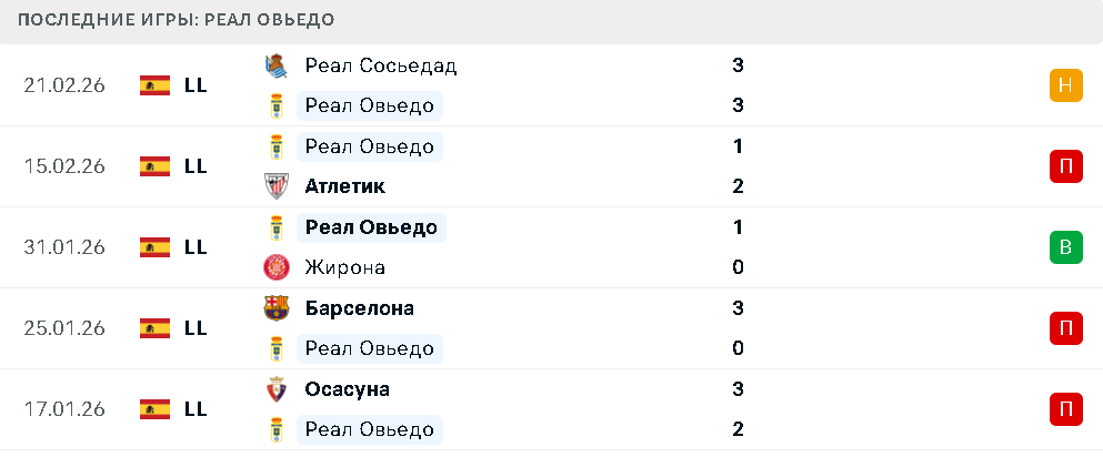 На своем поле «синие» выглядят увереннее. В пяти последних домашних матчах Ла Лиги «Овьедо» потерпел лишь одно поражение, трижды сыграл вничью и один раз победил. Поддержка трибун «Нуэво Карлос Тартьер» нередко помогает команде действовать более организованно и дисциплинированно, особенно против статусных соперников.