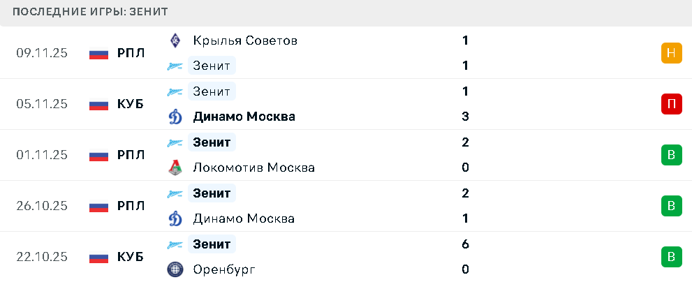 - «Зенит» одержал 7 побед в 10 последних матчах.