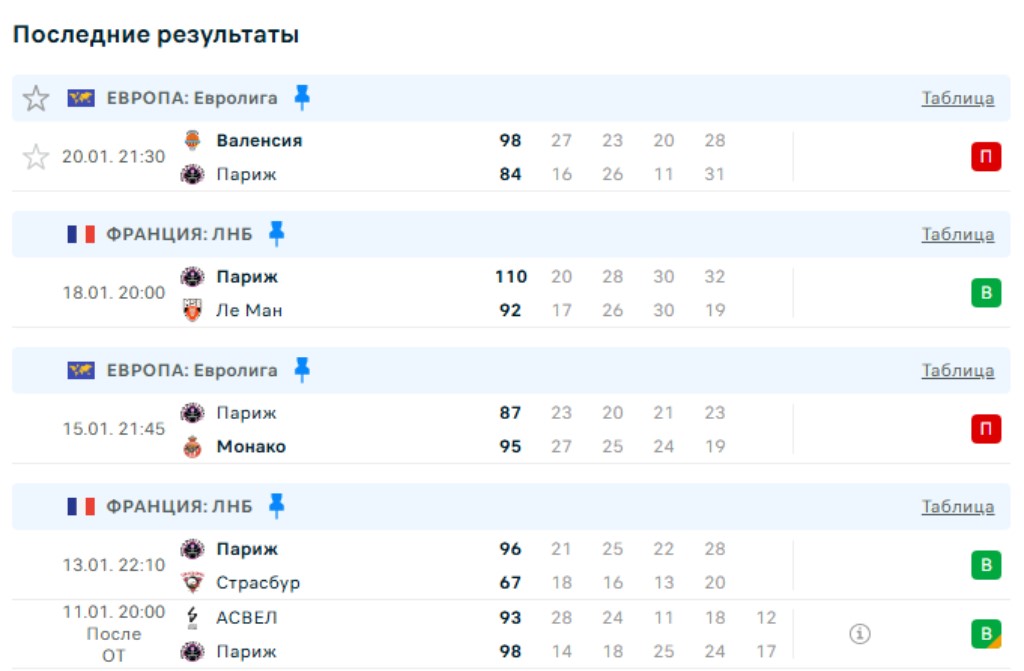 В чемпионате Франции Париж в воскресенье победил соседа по таблице Ле Ман 110:92 и сумел оторваться от конкурента. Сейчас команда Табеллини делит второе-третье место в национальном первенстве с Нантером, отставая на 2 победы от лидирующего Монако.