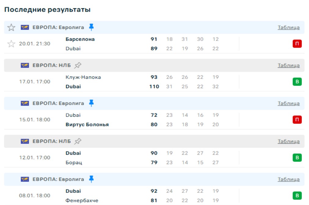 В предыдущем туре Евролиги во вторник Дубай дал бой в гостях одному из фаворитов турнира Барселоне. Клуб из ОАЭ лидировал в счете до середины второй четверти. Однако затем каталонцы отыгрались, вырвались вперед и перед последней 10-минуткой имели преимущество в 12 очков. Заключительную четверть Дубай выиграл 22:12, этого немного не хватило, чтобы перевести игру в овертайм. В итоге поражение 89:91.