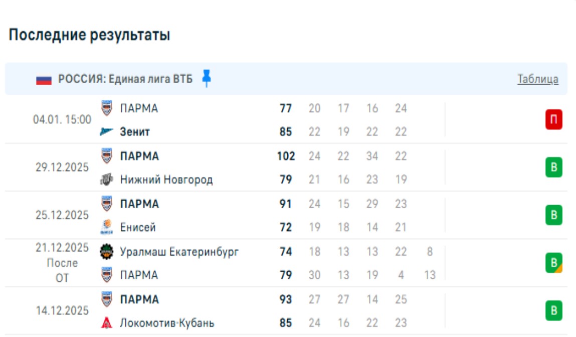 В прошлом поединке Парма уступила на своей площадке как раз питерскому Зениту, с которым ведет борьбу за попадание в тройку лидеров. Равная игра продолжалась до середины третьей четверти, когда Зениту удалось вырваться вперед на 12 очков. В дальнейшем команда из Северной столицы сохранила добытое преимущество и довела матч до победы 85:77.