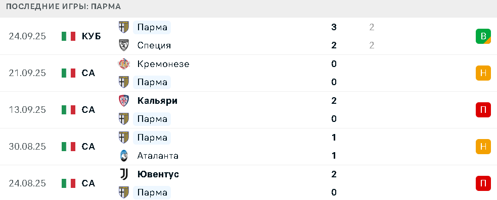 В пяти последних матчах в разных турнирах Парма потерпела поражения от Ювентуса и Кальяри, а также сыграла вничью с Аталантой, Кремонезе и Специей.