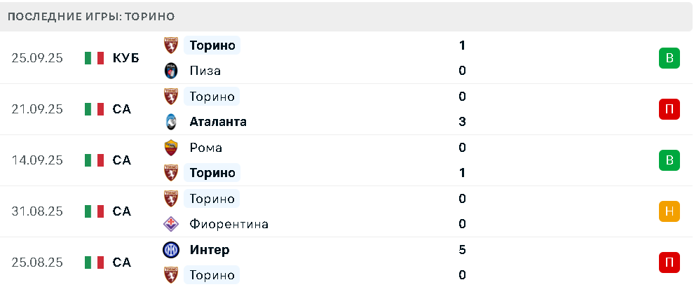 В пяти последних матчах в разных турнирах Торино потерпел поражения от Аталанты и Интера, одержал победы над Пизой и Ромой, а также сыграл вничью с Фиорентиной.