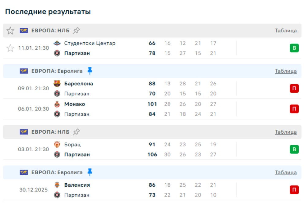 После нового года Партизан провел 2 матча в Евролиге. Сначала белградцы на выезде проиграли одному из лидеров турнира Монако. На прошлой неделе уступили в Испании Барселоне, еще одной команде из топ-4. В противостоянии с каталонцами Партизан лидировал в счете до конца второй четверти. Но затем инициатива полностью перешла к испанцам, которые завершили поединок в свою пользу 88:70.