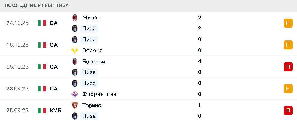 В пяти последних матчах в разных турнирах Пиза не одержала ни одной победы при трех ничьих с Фиорентиной, Вероной и Миланом. Также были поражения от Болоньи и Торино.