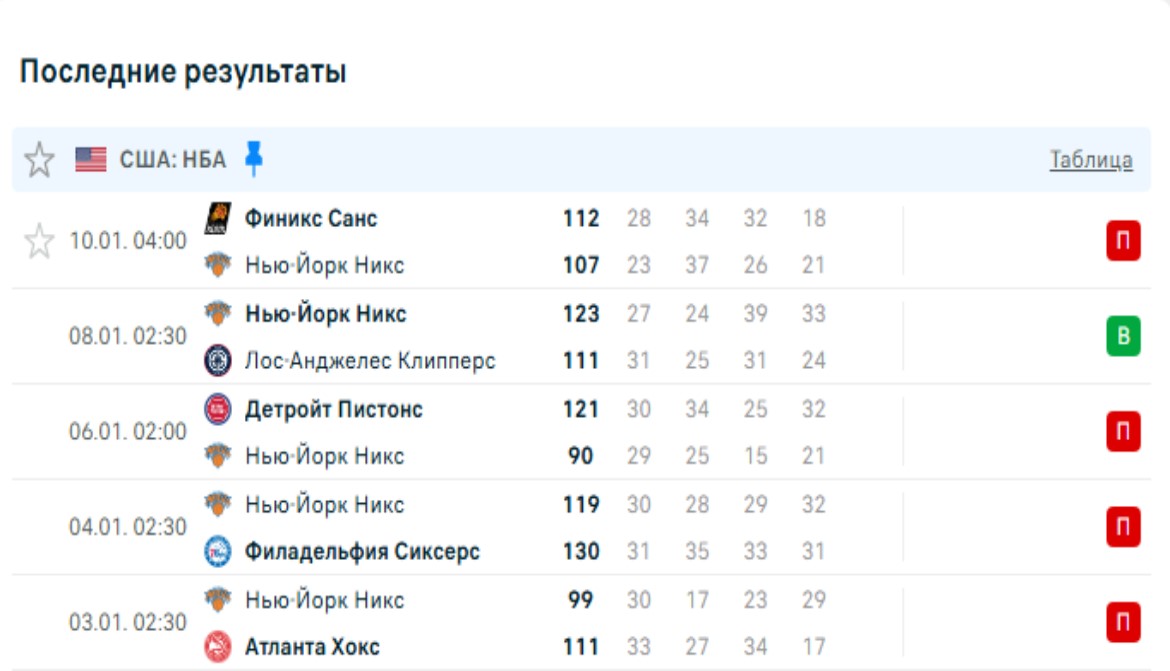 Последние игры Нью-Йорк Никс