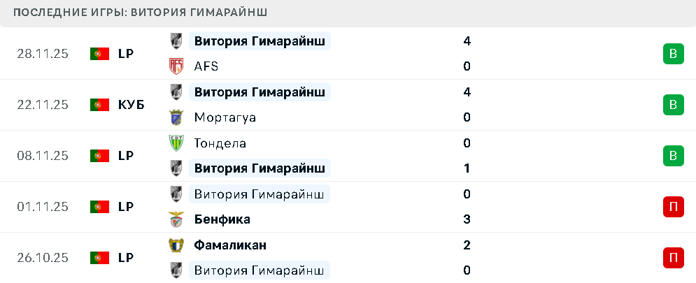 «Витория» одержала три победы подряд — над «Тонделой», «Мортагуа» и AFS. До этого команда потерпела поражения от «Фамаликана» и «Бенфики».