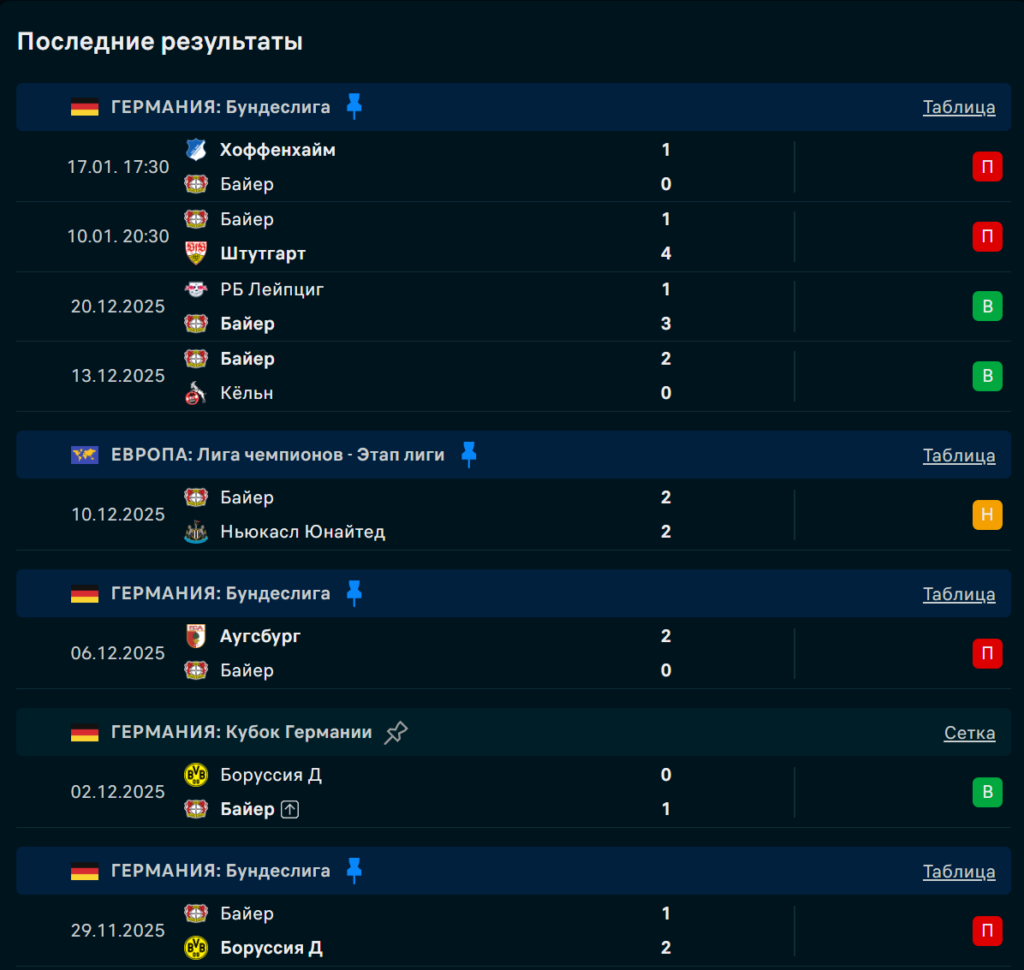 «Байер» переживает спад: 2 поражения подряд в Бундеслиге, 12 пропущенных голов в 6 матчах Лиги чемпионов. Команда молодая, нестабильная, с проблемами в реализации: в январе забито всего 1 гола в 2 матчах. Несмотря на победу над «Манчестер Сити» (2:0), xG показывает системное преимущество соперников в 5 из 6 еврокубковых матчей. Оборона уязвима при высоком прессинге.