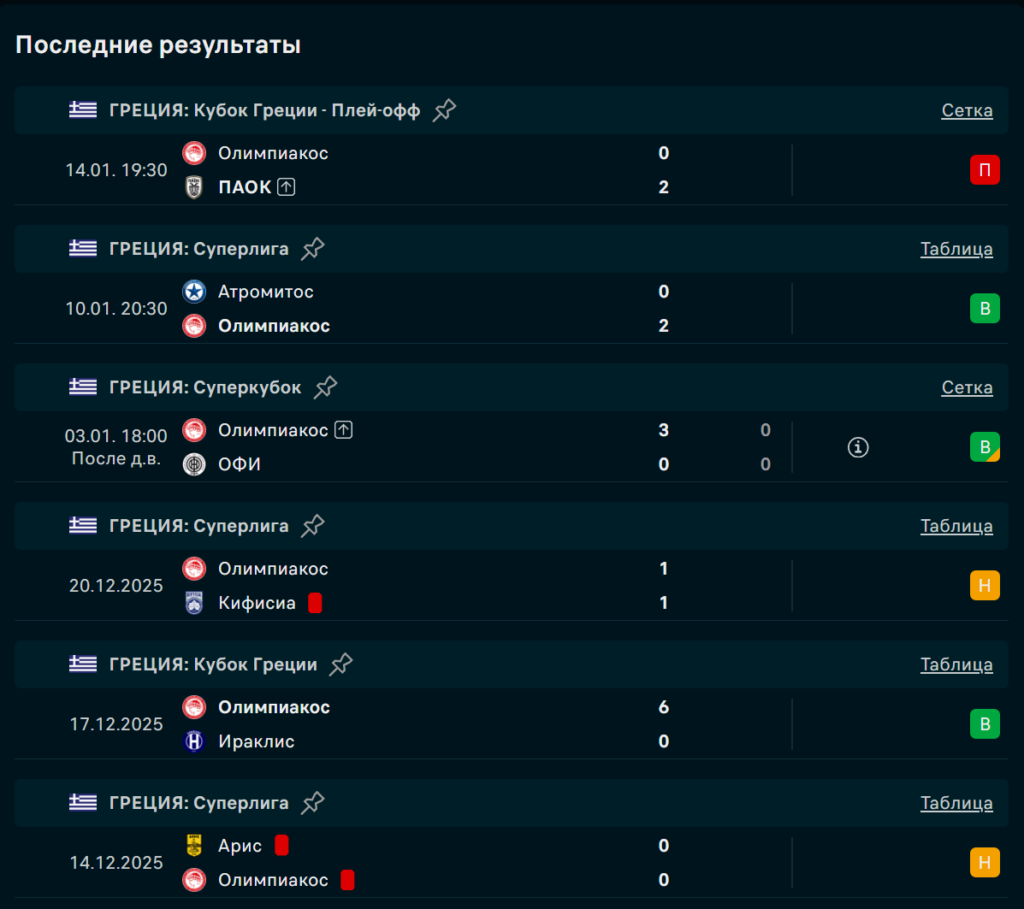 Последние игры Олимпиакос
