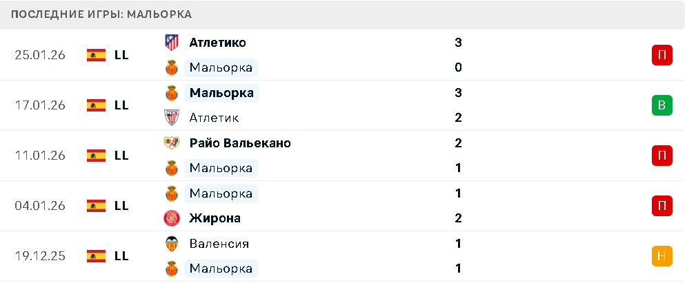 После крупного гостевого поражения от Атлетико в предыдущем туре Мальорка опустилась на опасное 18-е место в турнирной таблице Ла Лиги. Команда переживает очевидный кризис, однако по меркам аутсайдеров чемпионата Испании демонстрирует неплохую результативность. Главная проблема — слабая оборона: больше голов в текущем сезоне пропустили только три клуба. При этом на своем поле Мальорка выступает значительно увереннее. В 10 домашних матчах на стадионе «Эстади Мальорка Сон Моикс» команда набрала 16 очков из 30, одержав 4 победы и сыграв вничью еще 4 раза.
