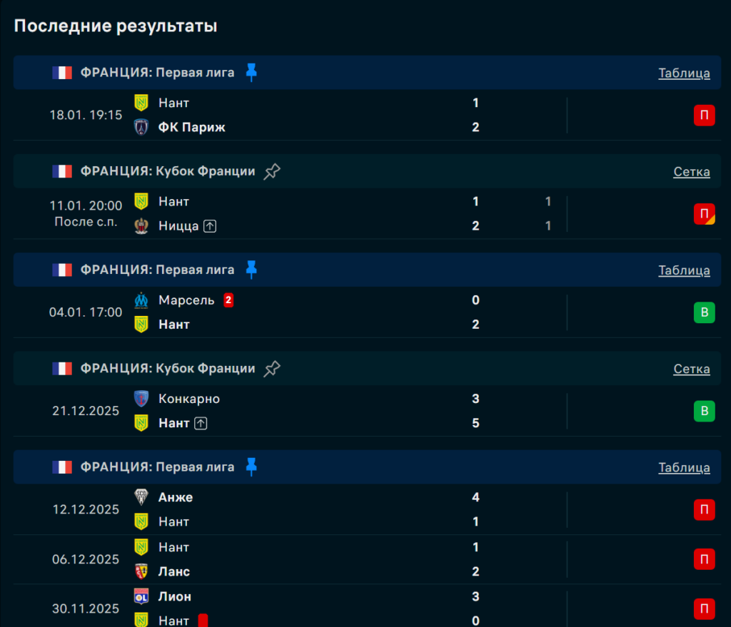 Последние пять матчей — две победы и три поражения. Но даже в проигрышах виден прогресс: против «ПСЖ» «Нант» создал больше xG, чем соперник, и уступил только из-за реализации. Дома — другая история: победа над «Марселем», победа «Конкаро» (5:3) в Кубке, уверенность растёт. Главное — не терять концентрацию, как в матче с «Анже» (1:4).