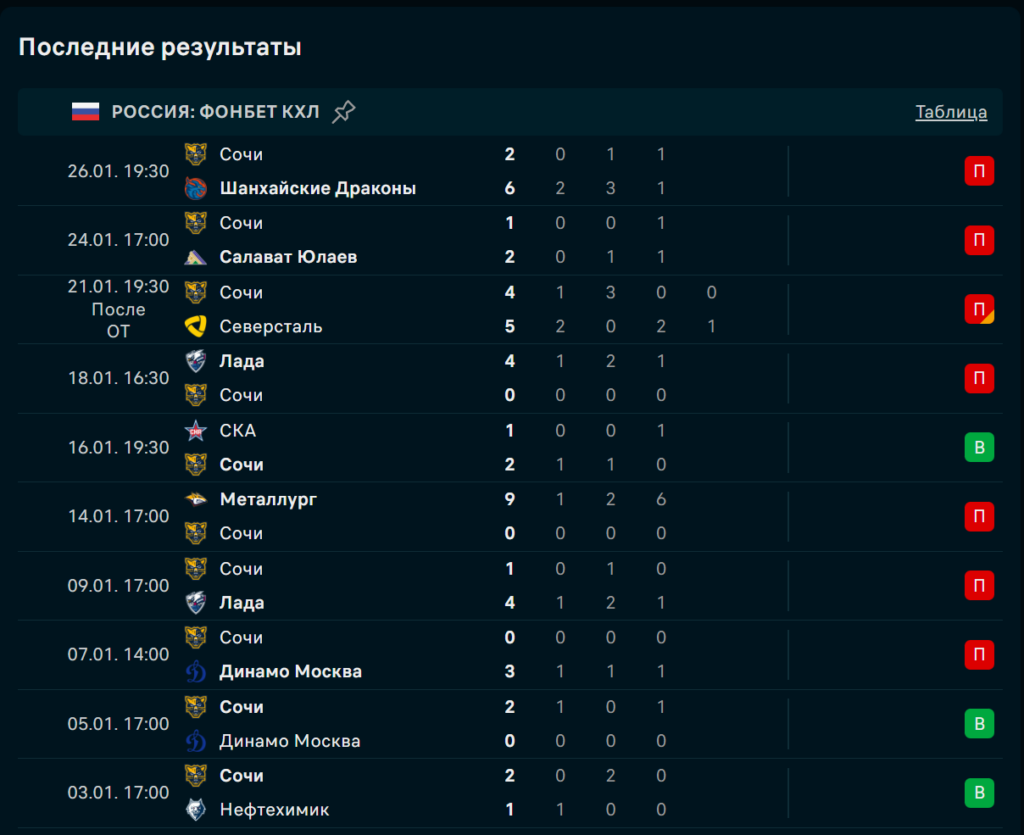 «Сочи» на длинном отрезке не держит уровень в своей зоне. После 2 : 6 с «Шанхаем» последовал упорный 1 : 2 с «Салаватом», где атака вновь просела при позиционном розыгрыше. Команда охотно бежит в переходы, но как только соперник удерживает первую волну, начинаются удаления и лишние минуты обороны, которые ломают замысел.