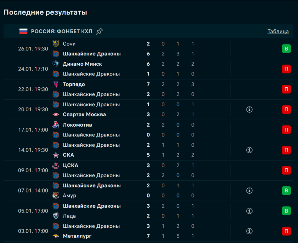 Статистика личных встреч Шанхайские Драконы — Сочи