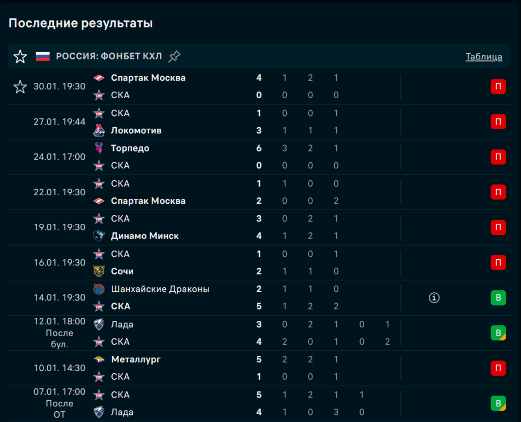 Последние игры СКА Санкт‑Петербург