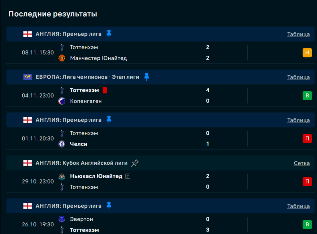 Серьёзные кадровые проблемы: травмированы Доминик Соланке, Педро Порро и Папе Матар Сарр. Это лишает «шпор» вариативности в атаке. Основная надежда — на Ричарлисона и Бентанкура. Викарио остаётся стабильным в воротах. Тактически «Тоттенхэм» будет играть глубоко, избегая рисков. <H2> Статистика личных встреч ПСЖ — Тоттенхэм Единственная очная встреча в 2025 году — Суперкубок УЕФА: 2:2, победа ПСЖ в пенальти. В регулярных матчах команды не встречались с 2019 года. Обе игры в августе и в прошлых циклах были результативными: в двух последних матчах забито более 3.5 голов.