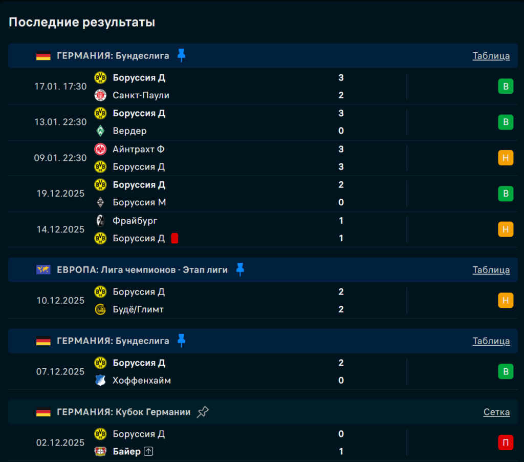 «Боруссия» обыграла «Санкт-Паули» (3:2), «Вердер» (3:0), «Боруссию М» (2:0), сыграла вничью с «Айнтрахтом» (3:3) и «Фрайбург» (1:1). В шести из семи последних матчей проходил тотал больше 2,5 голов.