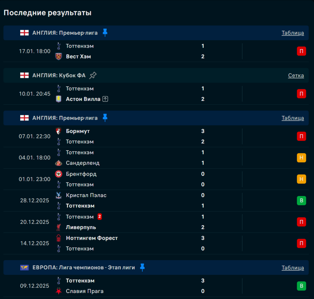 «Тоттенхэм» уступил «Вест Хэму» (1:2), «Астон Вилле» (1:2), «Борнмуту» (0:1), сыграл вничью с «Брентфордом» (0:0) и «Сандерлендом» (1:1). В четырёх из пяти последних матчей команда не смогла забросить более одного гола. Дома в ЛЧ — три «сухих» победы, но все против слабых соперников.