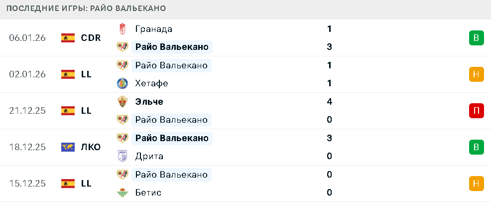 В пяти последних матчах в разных турнирах «Райо Вальекано» потерпел только одно поражение — от «Эльче». В остальных встречах команда одержала две победы над «Дритой» и «Гранадой», а также сыграла вничью с «Бетисом» и «Хетафе».