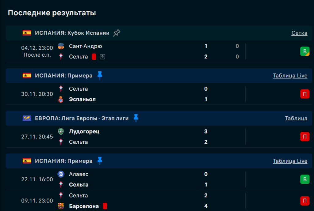 «Сельта» проиграла «Эспаньолу» (0:1), уступила «Лудогорцу» (2:3), победила «Алавес» (1:0), потерпела разгром от «Барселоны» (2:4) и выиграла у «Сант-Андрю» (2:1). Команда способна забивать даже против грандов, но оборона регулярно допускает ошибки в решающих моментах.