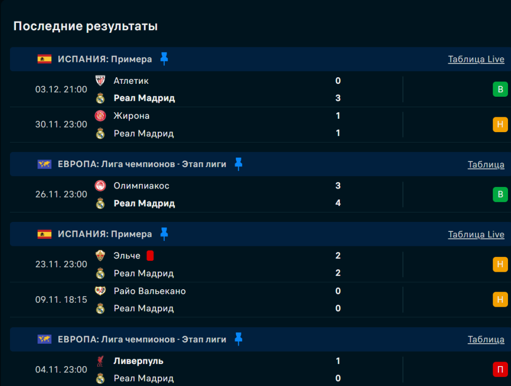«Реал» стабилен на своём поле: шесть побед в шести домашних матчах Ла Лиги с 15-ю забитыми и тремя пропущенными мячами. Команда не проигрывает в чемпионате с сентября. В игре против «Атлетика» проявились качества, которых не хватало в ничьих с «Жироной» и «Эльче» — контроль игры, точность в завершении и компактность в обороне. xG-статистика (36,87 ожидаемых голов при 32 реализованных) указывает на недоиспользованный атакующий потенциал, который может раскрыться в ближайших матчах.