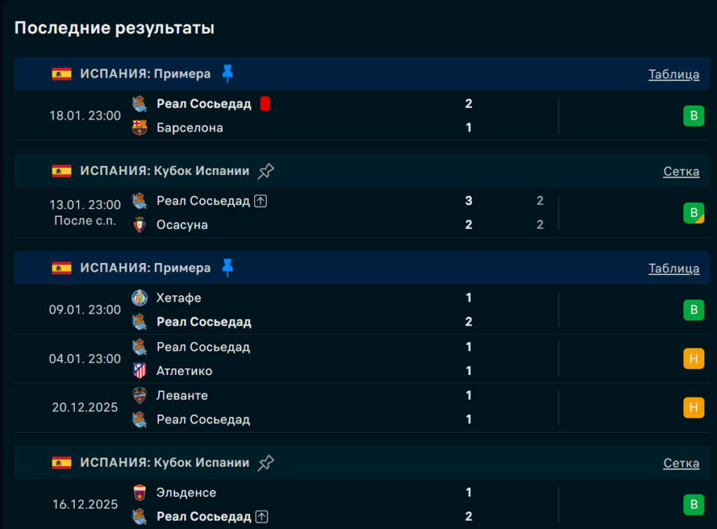 Последние игры Реал Сосьедад
