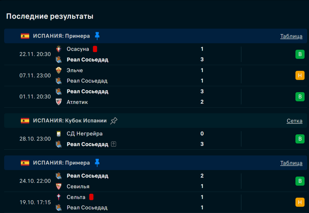 «Реал Сосьедад» не проигрывает в пяти последних матчах. 22 ноября команда уверенно обыграла «Осасуну» на выезде со счётом 3:1. Ранее, 7 ноября, была зафиксирована ничья с «Эльче» (1:1). На домашнем поле бело-голубые выиграли у «Атлетика» (3:2), «Севильи» (2:1) и «Негрейры» (3:0). В этих встречах команда демонстрировала высокую интенсивность, особенно в первом тайме, и умение контролировать игру через короткий пас и фланговые прорывы. Даже в матчах с аутсайдерами «Реал Сосьедад» не снижает темп, что подчеркивает его мотивацию и тактическую выучку.