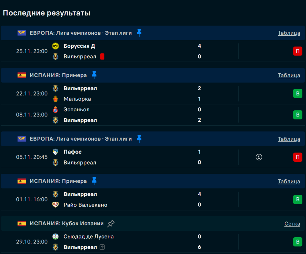 В ноябре 2025 года «Вильярреал» показал тревожную нестабильность в гостях. 25 ноября команда разгромно проиграла дортмундской «Боруссии» в Лиге чемпионов — 0:4. Ранее, 5 ноября, «жёлтая субмарина» уступила кипрскому «Пафосу» — 0:1. В то же время на домашнем поле были зафиксированы победы над «Мальоркой» (2:1), «Эспаньолом» (2:0) и «Райо Вальекано» (4:0). Эта полярность — сильная игра дома и провалы в выезде — делает прогноз на гостевой матч особенно сложным.