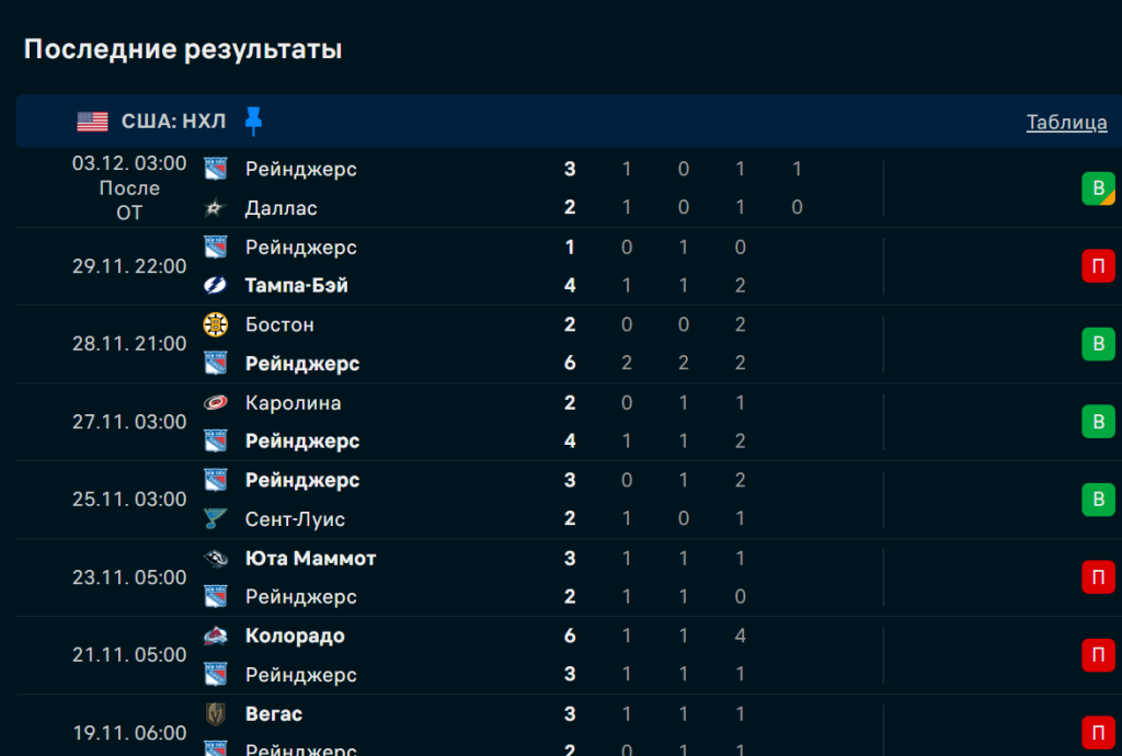 Последние игры Рейнджерс