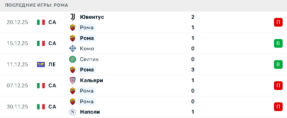 В пяти последних матчах во всех турнирах «Рома» одержала лишь две победы — над «Селтиком» и «Комо». В остальных встречах «волки» уступили «Наполи», «Кальяри» и «Ювентусу».