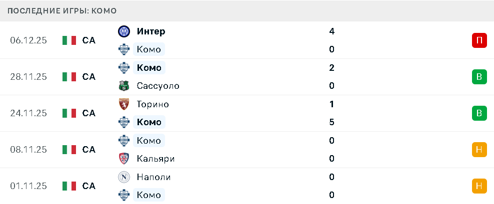 Крупное поражение от «Интера» в предыдущем туре стало единственным неудачным результатом команды в пяти последних матчах. До этого «Комо» сыграл вничью с «Наполи» и «Кальяри», а также одержал победы над «Торино» и «Сассуоло».