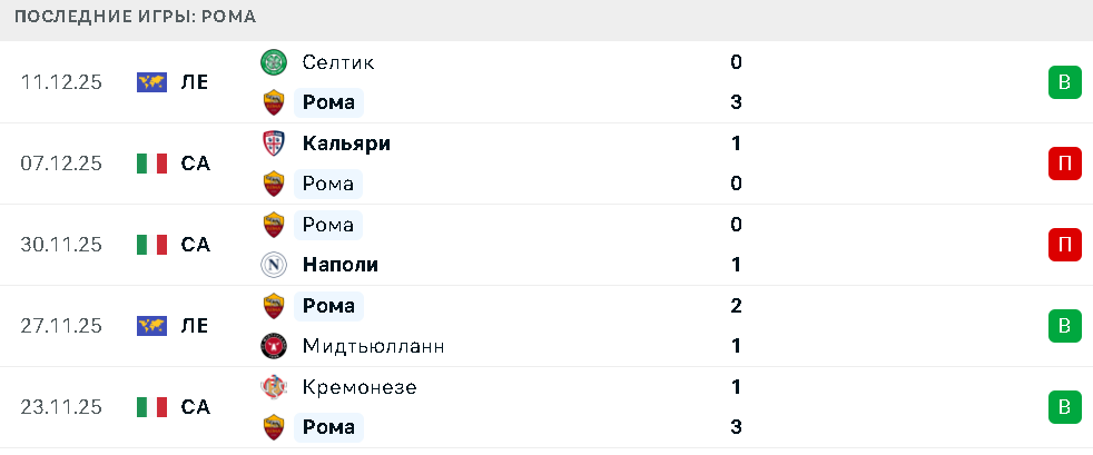В пяти последних матчах во всех турнирах «Рома» потерпела поражения от «Наполи» и «Кальяри», а также одержала победы над «Кремонезе», «Мидтьюлланном» и «Селтиком».