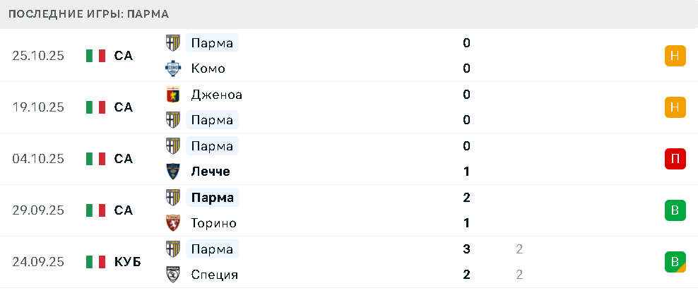 В пяти последних матчах в разных турнирах Парма потерпела только одно поражение от Лечче. В остальных случаях в основное время команда сыграла вничью с Дженоа, Комо и Специей. Также была победа над Торино.