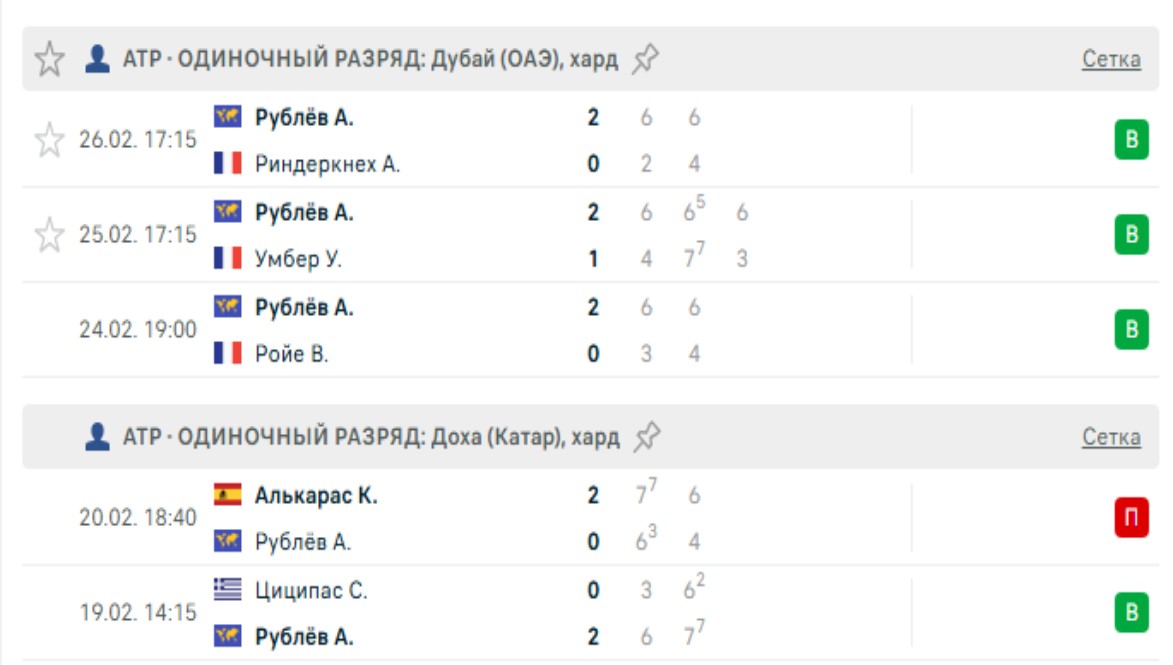 В пятницу, 27 февраля, в полуфинале турнира ATP в Дубае сыграют Андрей Рублев и Таллон Грикспур. В ОАЭ существует вероятность российского финала, так как в другом матче этой стадии Даниил Медведев сразится против Феликса Оже-Альяссима. По предварительным раскладам Рублев — фаворит. Какими будут его шансы на корте? Также на сайте можно найти информацию о том, где посмотреть трансляцию матча Рублев — Грикспур.