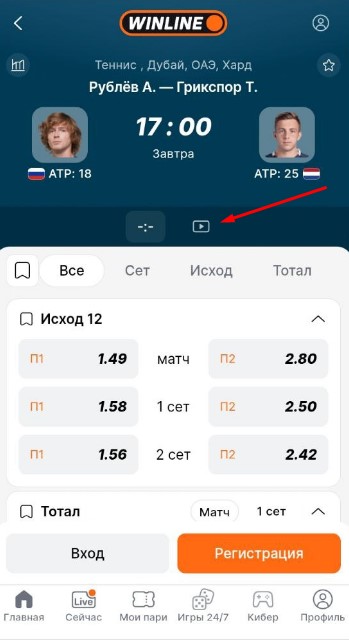Увидеть полуфинальные матчи и финал турнира можно в букмекерских конторах. Например, в «Винлайн» для просмотра достаточно авторизоваться или зарегистрироваться. Для этого нужно зайти на страницу события и нажать на Play.