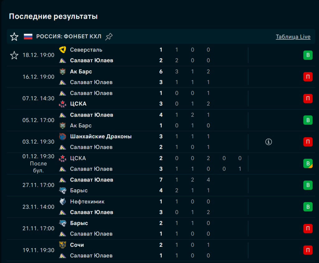 20 декабря, 14:30 МСК, «Уфа-Арена», Уфа. Регулярный чемпионат КХЛ, 37-й игровой день. «Салават Юлаев» занимает 9-е место на Востоке с 44 очками, отставая от зоны плей-офф на 2 балла. «Ак Барс» — 2-й с 50 очками, преследуя «Металлург». Уфимцы идут с противоречивой серией: победа над «Северсталью» (2:1) чередуется с крупным поражением от казанцев (3:6). «Ак Барс» выиграл 4 из 5 последних матчей, включая победы над «Трактором» (5:3) и «Салаватом» (6:3). Мотивация у обеих команд максимальна: хозяева борются за плей-офф, гости — за лидерство конференции.