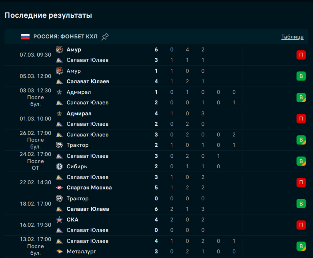 Последние игры Салават Юлаев