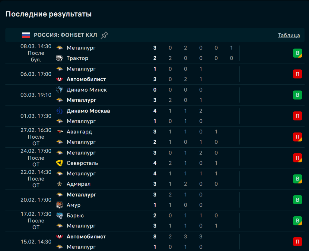 Последние игры Металлург Магнитогорск