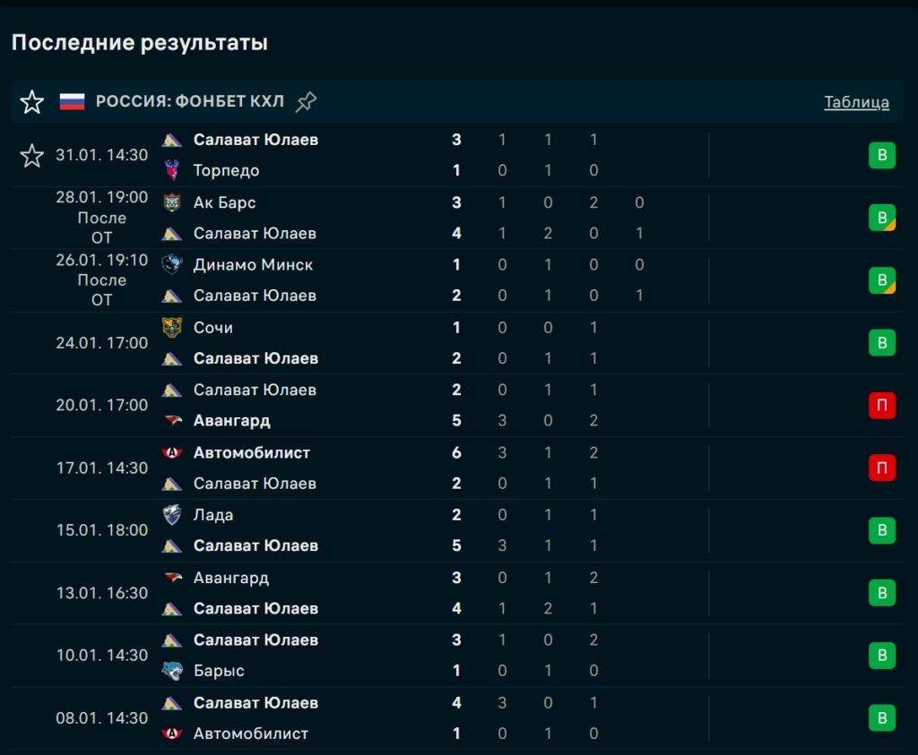 На выезде с «Динамо» Минск 2 : 1 ОТ и в Казани 4 : 3 ОТ уфимцы дожали концовки, играя без лишнего риска в средней. Между этими матчами была рабочая победа в Сочи 2 : 1. На домашнем фоне недавно случился провал с «Авангардом», но в целом команда чаще уходит в закрытые сценарии с контролем пятака и аккуратным «лишним».