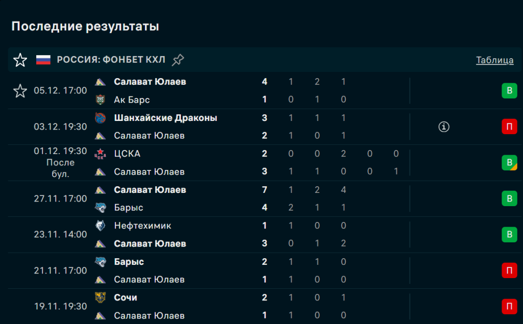 - В 4 из 5 последних матчей «Салавата» прошёл тотал больше 5,5