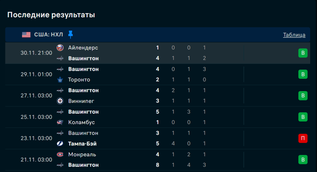 В последних пяти матчах «Вашингтон» выиграл четыре раза и один раз проиграл. Команда забросила 19 шайб и пропустила 10, демонстрируя баланс между атакой и обороной. Даже на выезде «столичные» сохраняют дисциплину и умеют контролировать темп игры. Команда выиграла 4 матча подряд, включая победу над «Айлендерс» (4:1), где Овечкин сделал 1+1, а Уилсон — 2+1.