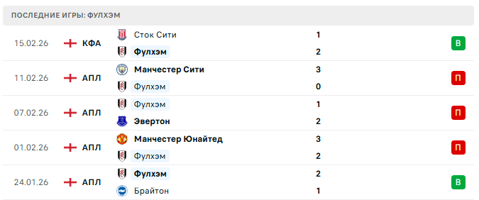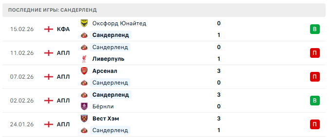 В трёх последних очных встречах «Фулхэм» не проигрывал ни разу. В ноябре 2025-го лондонцы победили 1:0 в рамках первого круга АПЛ. В феврале 2023 года «дачники» выиграли кубковое противостояние на «Стэдиум оф Лайт» 2:3, а в конце января того же года сыграли ничью 1:1 на своём поле. Серия без поражений — заметная тенденция, хотя тогда и «Фулхэм», и «Сандерленд» выступали в других условиях.
