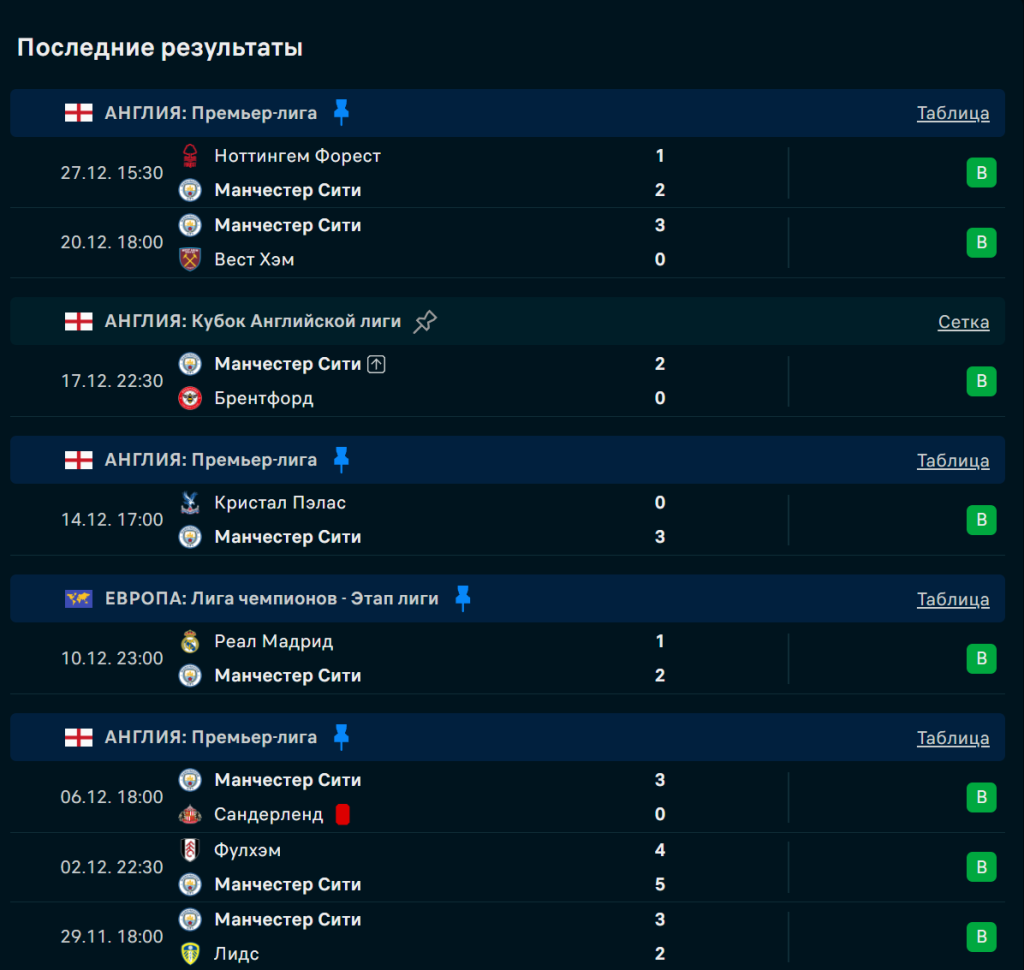 «Манчестер Сити» уверенно обыграл «Вест Хэм» (3:0), «Брентфорд» (2:0), «Кристал Пэлас» (3:0), «Реал Мадрид» (2:1) и «Ноттингем Форест» (2:1). В четырёх из пяти матчей прошёл ТБ(2,5), а в трёх — обе забили. Команда стабильно забивает минимум два гола, даже на выезде.