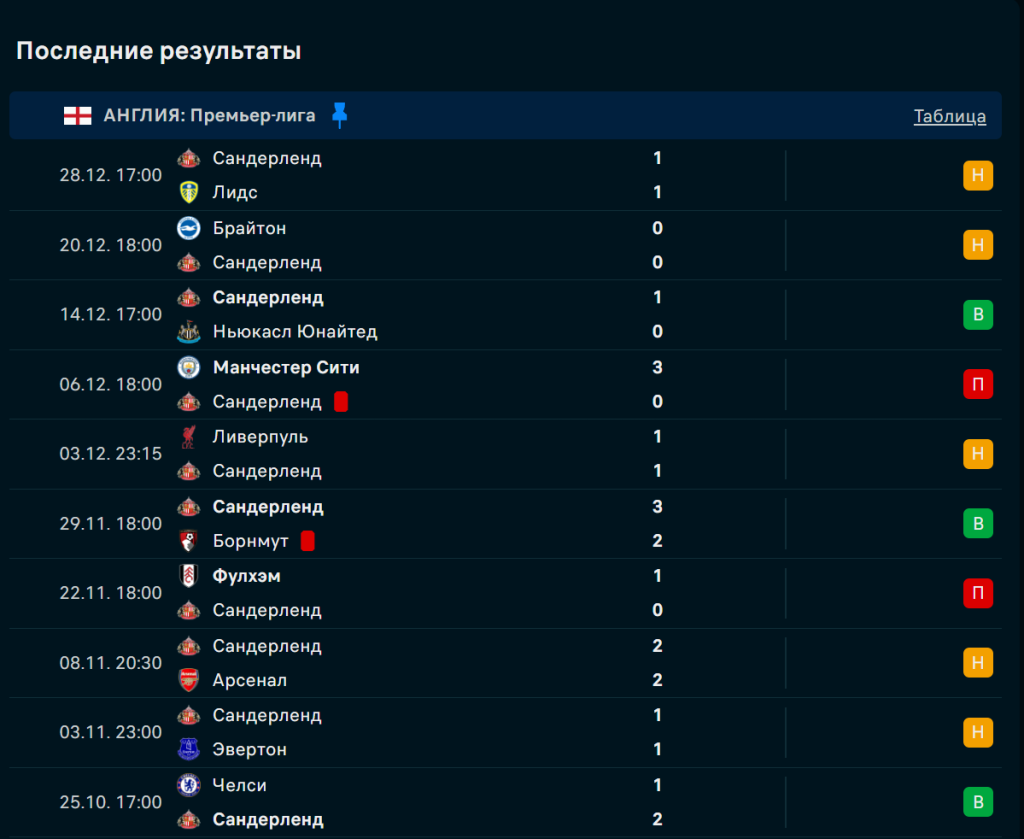 «Сандерленд» сыграл вничью с «Лидсом» (1:1) и «Брайтоном» (0:0), выиграл у «Ньюкасла» (1:0), но уступил «Ливерпулю» (1:1) и «Манчестер Сити» (0:3). В четырёх из пяти матчей было забито не более двух голов, а ТБ(2,5) прошёл лишь в одном поединке. Команда демонстрирует низкую результативность и ориентацию на минимизацию поражений.