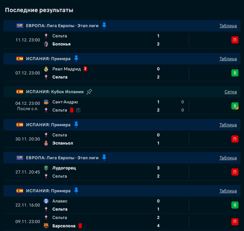 «Сельта» демонстрирует переменчивую, но боевую игру: 3 победы и 2 поражения в последних 5 матчах. Главный козырь — победа над «Реалом», где команда проявила дисциплину в обороне и хладнокровие в атаке. Дома «кельты» пока не выиграли в Ла Лиге (5 ничьих, 3 поражения), но забивают регулярно — 18 голов за 15 туров. xG-статистика (23,77 ожидаемых пропущенных при 19 реальных) указывает на удачу в обороне, но моральный подъём после победы над грандом может компенсировать уязвимости.