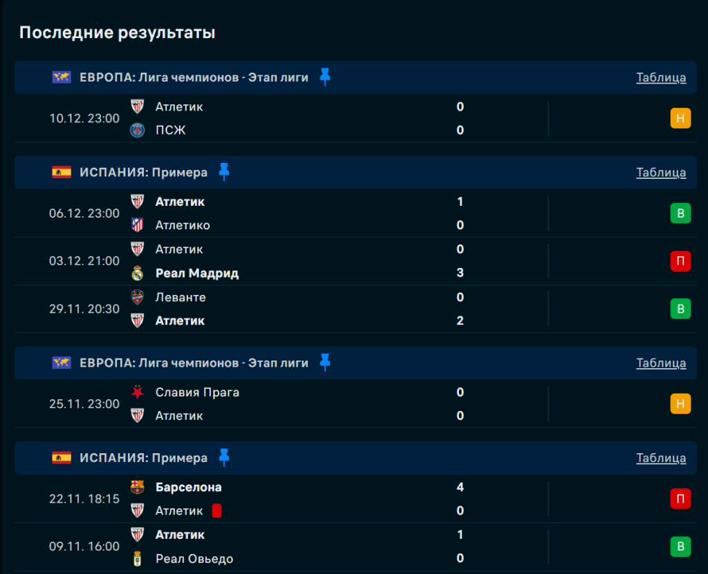 «Атлетик» — прагматичная команда с сильной обороной, но слабой реализацией. В последних 5 матчах — 3 победы, 2 поражения. Команда не пропустила от ПСЖ и «Атлетико», но проиграла «Реалу» 0:3. xG (22,50 ожидаемых забитых при 15 реальных) подтверждает: баски создают моменты, но не реализуют. На выезде — 1 победа в 5 матчах Ла Лиги. Критически важны травмы: Ляпорт, Эгилиз и Прадос — вне игры, что ослабляет центр обороны.