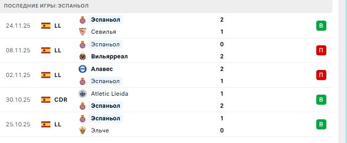 В последних пяти матчах команда демонстрирует нестабильные результаты: победы над «Севильей» (2:1) и «Атлетик Лиедой» (1:2) чередуются с поражениями от «Вильярреала» (0:2) и «Алавеса» (2:1).